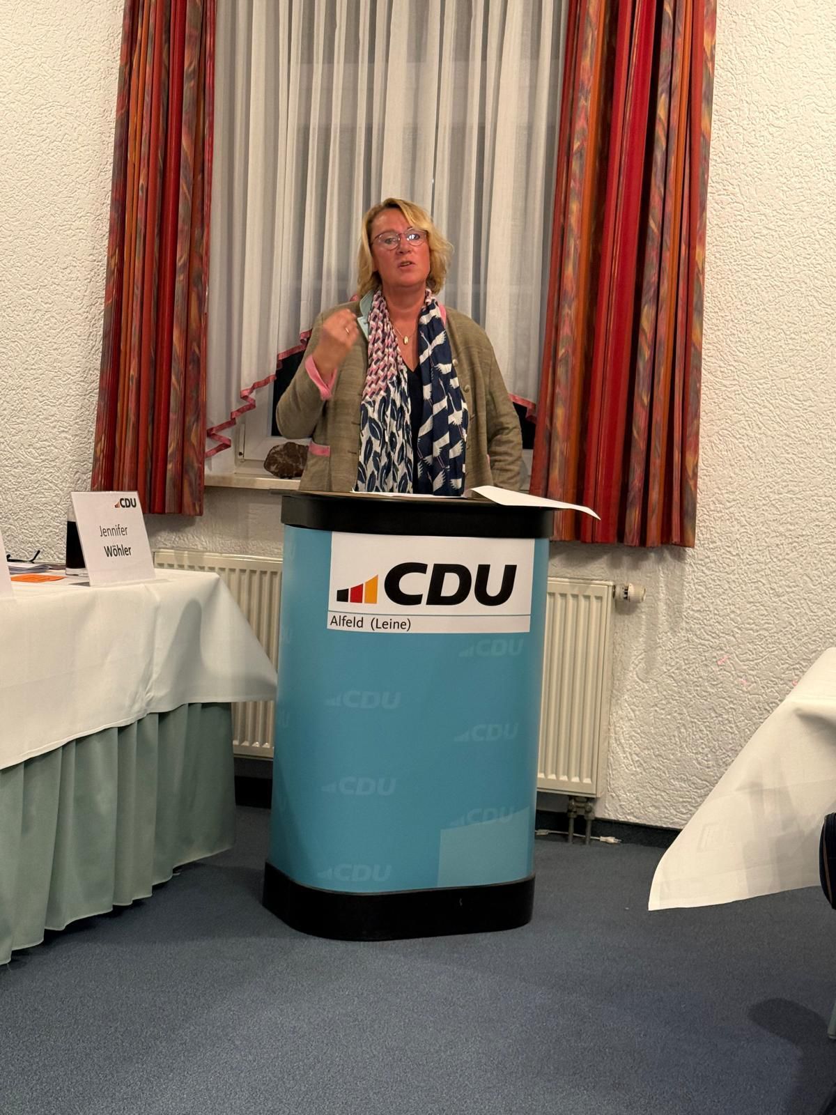 Die stellvertretende Vorsitzende Peggy Kayser begrüßte die anwesenden Parteifreunde herzlich, darunter die Vizepräsidentin des Niedersächsischen Landtages Barbara Otte-Kinast, die Landtagsabgeordnete Laura Hopmann sowie die Kreistagsabgeordnete Ute Bertram. Ein besonderer Gruß galt außerdem den Ehrenbürgern der Stadt Alfeld, Margarete und Ernst-Martin Behrens.